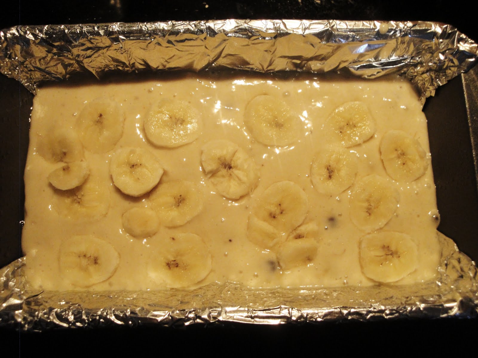 Pour into loaf pan and top with the sliced bananas. Using your fingers, push the slices of banana into the batter so that they are submerged.